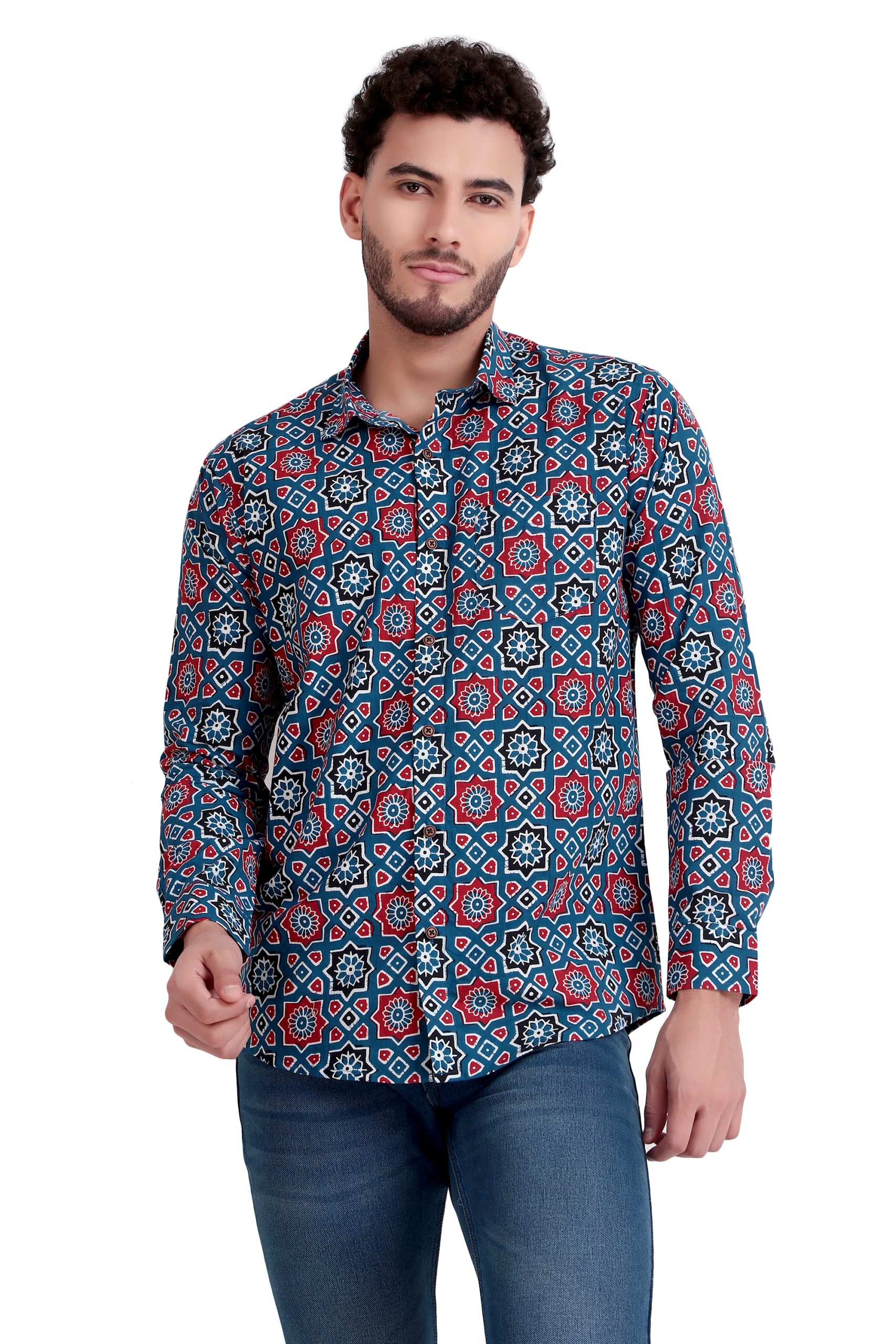 Make a statement with this Jaipuri Handblock Printed Pure Cotton Men’s Shirt, designed for the modern man who appreciates art and comfort. Crafted by Rajasthani artisans, this shirt showcases intricate geometric motifs in deep indigo, red, and white tones — hand-printed using age-old block printing techniques. Made from 100% pure cotton, it offers superior breathability and softness, making it perfect for all seasons. The full-sleeve design and tailored fit add sophistication, while the vibrant pattern ensures you stand out effortlessly. Pair it with jeans for a casual edge or chinos for a semi-formal touch. Every piece reflects the essence of Indian craftsmanship blended with contemporary style — a must-have addition for those who value sustainable fashion with a cultural soul.